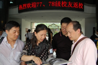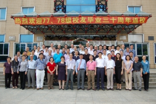 | 学院门前飘扬校友们签名的旗帜 | 77、78级校友和学院领导老师合影 |