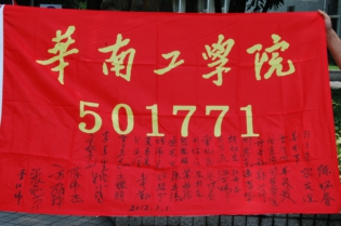 77、78级校友是华工人的骄傲,被称为“华工三剑客”的T C L董事长李东生、创维集团前董事长黄宏生、康佳原掌门人陈伟荣就来自77线无线电系。当天,电子与信息学院迎来黄宏生等校友,校友们在中山像签到后,驻足在签名墙和展墙间,展墙上七八十年代的黑白照片,勾起了老校友们三十年前在校那段美好的回忆,三十年,只是青春不再。让笔者感动的是,两位77无线电系校友带来了属于他们班永久的记念品——全班同学签名的锦旗。锦旗上面“华南工学院 501771和501772”成为他们共同的回忆和约定。