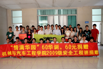 安工学子情切切,不忘华园三春晖。5月23日上午,值母校即将迎来60华诞之际,为积极响应学校“华园情”校友年度捐赠活动的号召,机械与汽车工程学院2009级安全工程班举行了“情满华园,60华诞,60元捐赠”的仪式,09安工41位学子合力以及以“校园十佳班集体”所获奖金,向学校捐赠2460元,为母校表达拳拳之心。学校公共关系处、校友总会秘书处、机械与汽车工程学院相关老师出席, 09安工全部同学参加捐赠仪式。