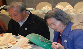 | 老校友认真阅读会刊 | 校友们认真阅读校友会刊物 |