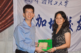 | 新加坡校友会向母校赠送纪念品 | 陈艳秘书长代表母校向新加坡校友会赠送纪念品 |