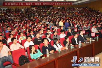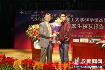 ![]() 报告会现场座无虚席 | ![]() 黄宏生校友接受同学赠送的鲜花 |