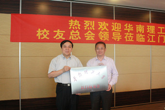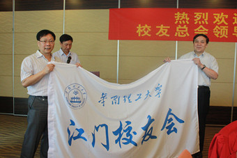 活动上,刘树道转达了学校领导和校友总会对广大江门校友的亲切问候,并介绍了学校在新时期的发展情况,他希望广大校友继续支持和关注学校的建设。之后,刘树道向江门校友会授予了会牌与会旗。李铭钧代表江门校友会对学校一行到访江门表示热烈欢迎,向母校对江门校友会的关心与支持表示崇高的敬意,对江门校友会正式获得母校的会牌与会旗表示了衷心的感谢,并表示江门校友会会一如既往地加强与母校的紧密联系,为母校的发展贡献自己的力量。