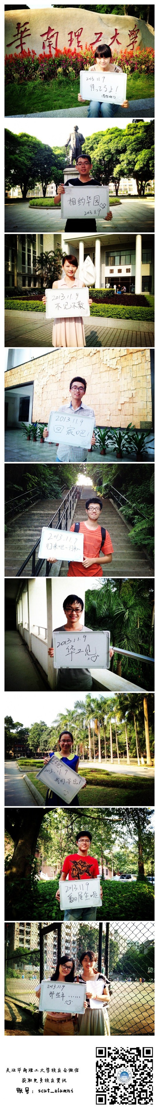 即日起,在校学生、老师只要制作对2013年11月9日华工校友返校日的祝福标语,在校内景点或教学(宿舍)楼前持标语拍照发微博并(连接)@华南理工大学校友会,即可在校友返校日当天获赠纪念品一份,创意与人气前20位微博主还可获赠纪念画册一本。2013年校友返校日,有你!有我!2013.11.9,华工见!
