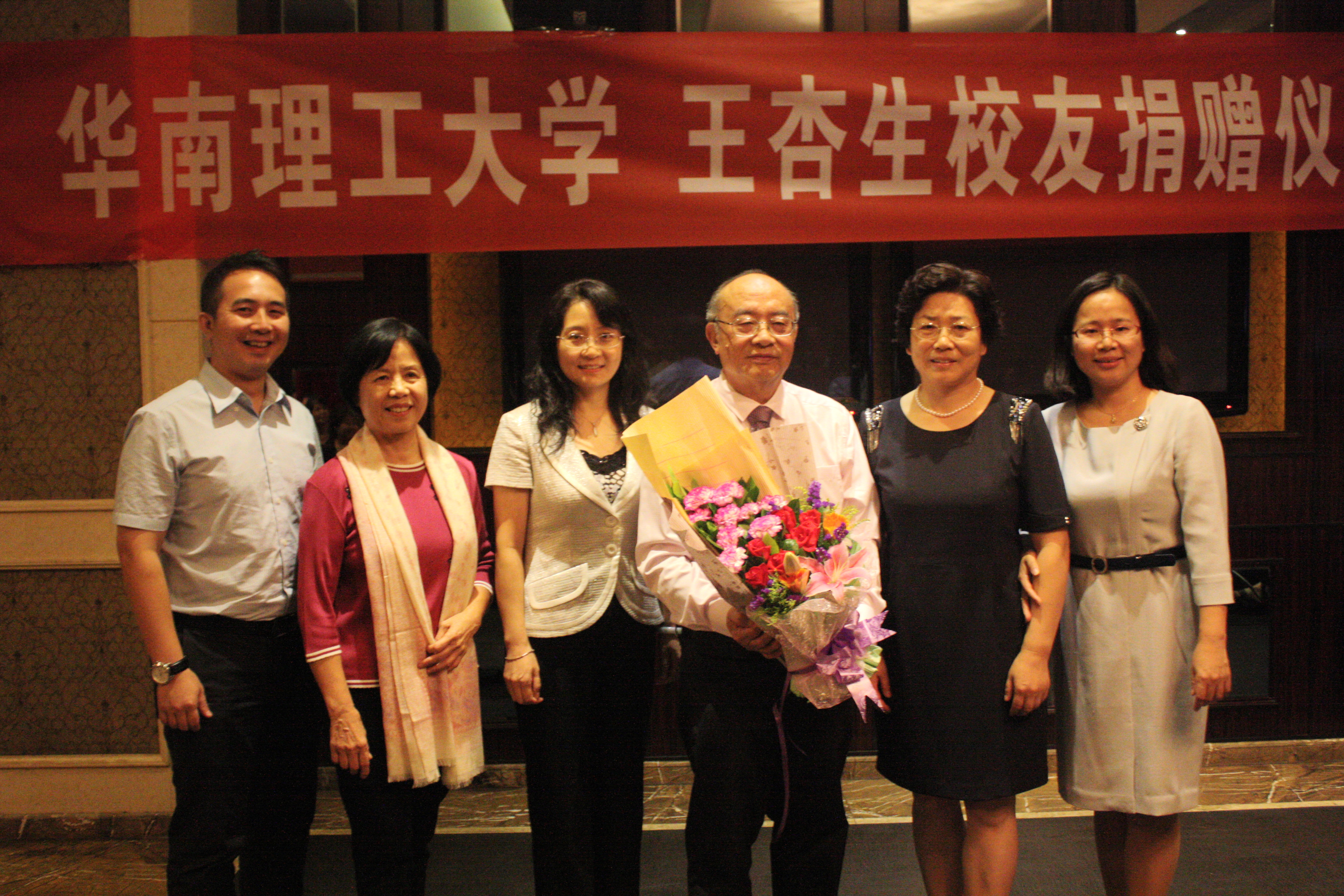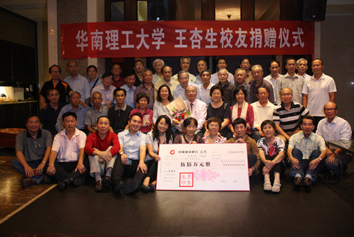 10月19日晚,在我校7038班校友举办入学50周年聚会之际,为迎接华南理工大学61周年华诞,我校63级化工系校友、泰国利士中轮胎集团董事长王杏生向学校捐赠人民币500万元,用于支持母校化学与化工学院大楼的建造。捐赠签约仪式在广州市番禺区一酒店内举行,学校党委副书记、教育发展基金会常务副理事长刘琪瑾,学校校友总会、教育发展基金会、化学与化工学院等单位负责人和我校化工系7038班全体校友共同见证了这一欢庆时刻。
