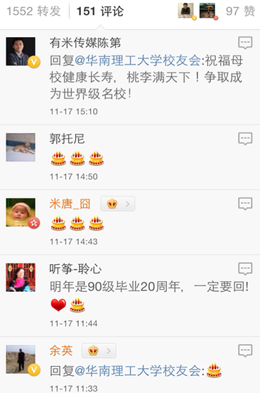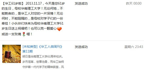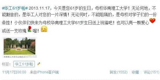 2013年11月17日,在母校华南理工大学建校61周年校庆之际,华南理工大学校友会微博、微信于17日凌晨00:00送上对母校61岁生日的祝福。无论何地,不能割舍的,是华工人对母校的一片深情!无论何时,不能阻隔的,是母校对学子们的一份牵挂!