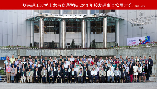 2013年11月23日下午,华南理工大学土木与交通学院第一届校友理事会换届大会以“情系母校 共同发展 迈向国际 开创未来”为主题,在美丽的海滨之城深圳市蛇口明华国际会议中心隆重召开。华南理工大学常务副校长彭新一、招商局集团副总裁兼业务开发部总经理、总经济师余利明、原广东工业大学党委书记陈年强、原广东省惠州市人大常委会副主任陈恩强、原广州美术学院党委副书记何广基、招商局地产控股股份有限公司副总经理胡建新、广州市黄埔区人大常委副主任刘岳生出席会议。学校校友会秘书处副秘书长许中华、麦冬宁,土木与交通学院校友理事会成员、教师代表以及来自全国各地的校友、嘉宾170余人欢聚一堂。大会由土木与交通学院党委书记罗毅主持。