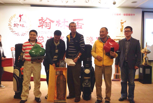 经过长达数小时的激烈角逐,成绩在裁判团的紧张统计后亦见分晓。晚上7点,中国高尔夫频道的著名主持人黄江随即宣布第四届广东高等院校“翰林杯”高尔夫精英赛总决赛颁奖晚宴正式开始。华南理工大学校友高尔夫球队以总杆710杆的成绩获得本届赛事冠军,广东外语外贸大学校友高尔夫球队以总杆733杆,中山大学校友高尔夫球队联队以总杆734杆的成绩分别获得亚军和季军。我校校友高尔夫俱乐部参赛会员怀着无比激动和喜悦的心情登上舞台领奖,队长刘恕激动地高挥起了队旗,共同庆祝这一激动人心的时刻。此外,我校校友获得嘉宾赛净杆的冠军和亚军。