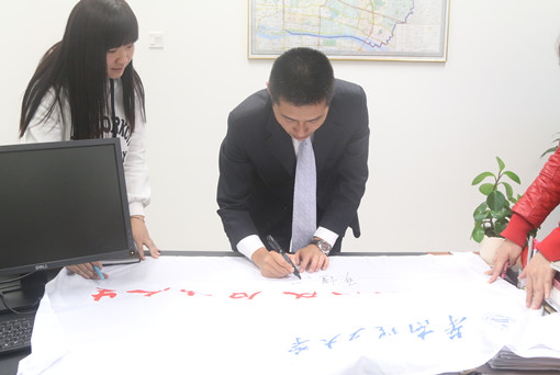 ![]() 张海波校友在访谈旗帜上书写寄语 |