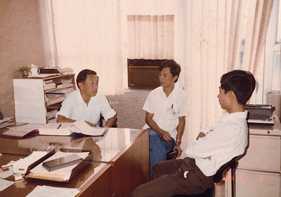 ![]() 80年代中,麦伯良与李启元、黄守廉在办公室研究工作 |