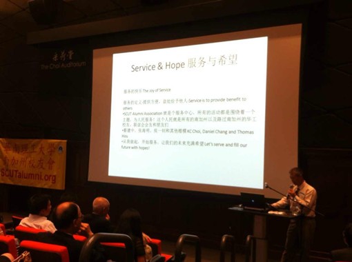 本次活动由南加州校友会财长、我校77级英语专业谢建党校友主持。Occidental College副校长Mr.James应邀致开幕辞,致敬蔡建中、罗爱梅校友伉俪捐资修缮学校音乐厅-“采荷堂”Choi Auditorium这一善举。南加州校友会秘书长,我校80级工业与民用建筑工程专业劳峰校友做校友会工作汇报。劳峰校友重点介绍了母校六十周年校庆庆典盛况和蔡建中、罗爱梅校友伉俪,张海明、蔡丽校友伉俪捐资助学华工的慈善之举。