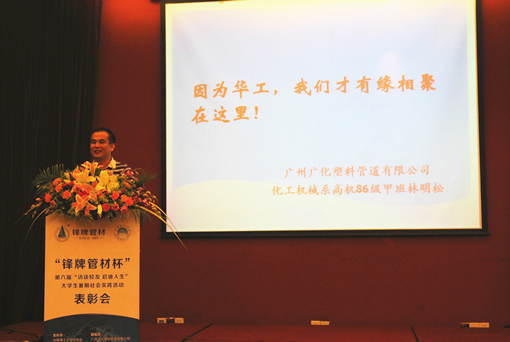 2014年10月30日,“锋牌管材杯”第六届“访谈校友 启迪人生” 大学生社会实践活动总结表彰会暨林明松校友创业分享会在番禺四海一家顺利举行。广州广化塑料管道有限公司董事长林明松校友和校友会秘书处、校友工作处、校团委负责人以及参与访谈活动的学生志愿者等约70多人参加了表彰分享会。