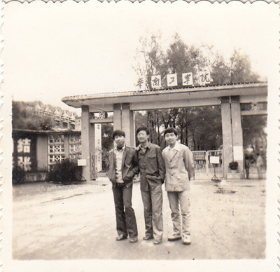 ![]() 读书时代的黄建平校友与同学在学校正门合影 |