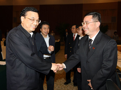 ![]() 时任中央政治局常委、国务院副总理李克强同志视察东莞时与黄建平校友握手 |