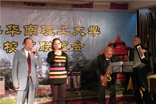 会议结束后,庆祝晚宴正式开始。校友们品尝佳肴美酒,回忆当年在母校学习和生活的情景,就一年来的生活、工作、思想进行交流,相互祝酒致意,期待新一年里更加美好的生活。席间,演出嘉宾们献上了精彩的文艺节目,校友们也踊跃参加。88岁高龄的何月梅校友演唱了83年前自己学唱的儿歌,82岁的冯耀材校友也演唱了多首经典名曲,张恒校友和蓝惠霞校友6岁的女儿张怡嘉小朋友也表演了英语演讲……校友和嘉宾们载歌载舞,在乐队演奏乐曲的伴奏下,校友们击掌唱歌,将欢乐的气氛推向高潮。