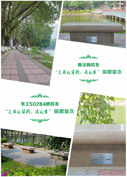 东西湖畔,身影熙熙;金银岛上,书声琅琅。每一条弯曲的林荫小道都留下了华工人青春的脚步,每一座厚实的校园石凳都承载着华工学子如诗的记忆! 2014年11月华南理工大学第二届校友返校日期间,不少校友通过认捐石凳的方式,参加“美丽的华园,我的家”系列捐赠活动,为母校的建设添砖加瓦。