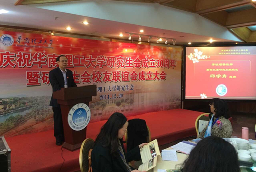 经过数月的紧张筹备,“研途•青春•筑梦”华南理工大学研究生会成立30周年庆祝活动暨研究生会校友联谊会成立大会于2014年12月20日正式举行。学校党委副书记张振刚、副校长邱学青、学校党委常委陶韶菁、校友工作处处长陈艳、副处长许中华、研究生院、校团委等部门负责人与1984年至今的历届研究生会指导老师、百余名研究生会干部校友相聚母校,聊青春、叙“研”情,共庆研会盛事。邱学青副校长在大会上致辞,他表示,在广大校友的支持下,学校经过62年的建设,已发展成立足华南、面向全国、具有明显工科优势和特色,在海内外享有良好声誉的综合性研究型大学。30年来,经过数十代研究生会人的辛勤付出,研究生会在学校研究生教育的发展进程和学校各项建设中起到了重要的作用。举办此次联谊会,旨在为校友建立一个寄托情感、联络友谊、交流信息的平台,通过校友联谊会进一步扩大母校在社会上的影响力,为社会和学校的发展做出更大贡献,也期望校友联谊会为在校的研究生们提供一些成长道路上的关爱和指引。