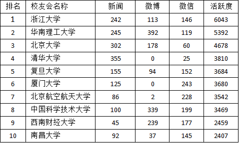 报告显示:浙江大学校友会活跃度为6043,全国高校校友会排名第1;华南理工大学校友会活跃度为5392,全国高校校友会排名第2;北京大学校友会跃度为4678,全国高校校友会排名第3;清华大学、复旦大学、厦门大学、北京航空航天大学、中国科学技术大学、西南财经大学和南昌大学7所大学校友会活跃度依次排名第4至第10名。据悉: 作为中国高校校友会动态信息展示及交流中心,友笑网(http://www.usho.cn/)由杭州友笑网络科技有限公司创办,定期出版电子期刊《友笑•中国高校校友会动态》,是服务中国高校校友会发展服务交流平台,其企业愿景为:帮助中国高校校友会运作,使其成为高校的核心工作之一。(图/文 秦鹏 校友会秘书处)