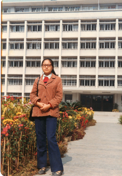 ![]() 在华南工学院读书时的任灵于一号楼前留影 |
