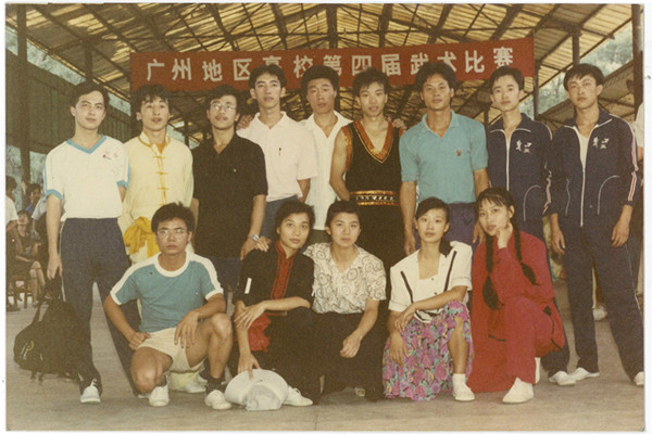 ![]() 1991年广州地区高校第四届武术比赛在华工东区训练棚举行,我校获得团体总分冠军。图为梁旭辉(后左一)及武术队教练黄帝全老师(后右三)和队员合影 |