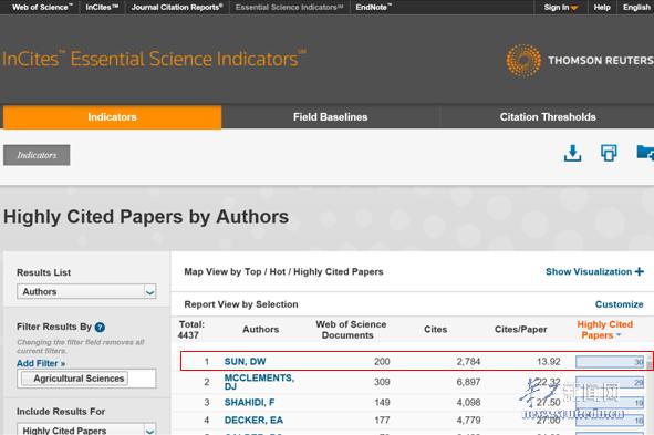 除了给出居世界前1%的研究机构、科学家、研究论文,居世界前50%的国家/地区和居前0.1%的热点论文的排名外,ESI还特别给出反映当今世界科学水平的“高被引论文”(Highly Cited Papers),即某一科学家、机构、国家/地区以及期刊在特定学科领域和年限中被引频次排名在世界前1%的论文。ESI所给出的排名统计表即基于高被引论文数量计算所得,从而排出了特定学科位居全球前1%的最有影响力和冲击力的科学家的世界名次。根据最新统计结果,孙大文院士发表的论文被SCI收录的多达400多篇,其中共有30篇被ESI评为“高被引论文”,在农学领域高被引的科学家中排名第一。