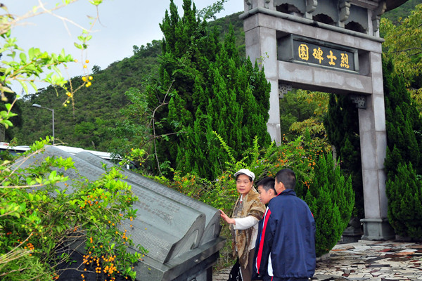 徐月清校友(左一)为参加活动的小学生认真讲解烈士碑园“石书”的建造