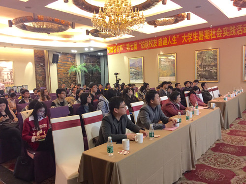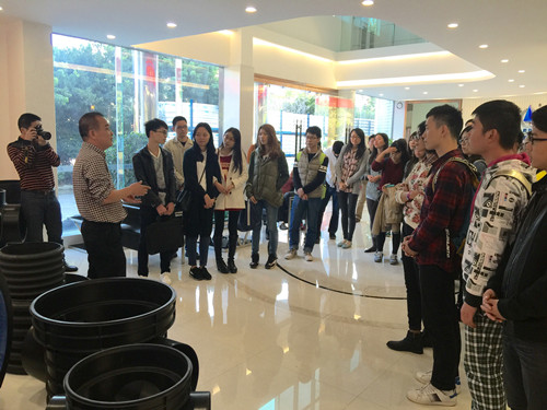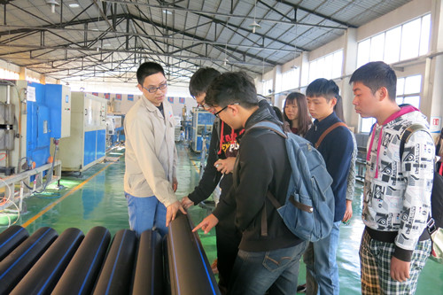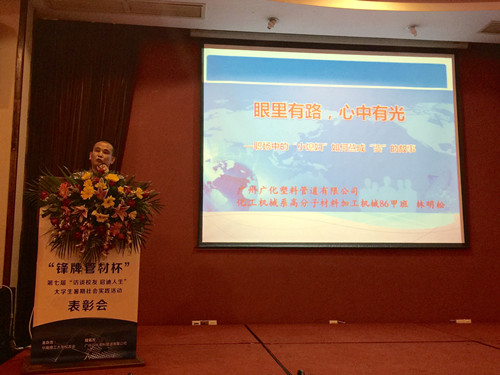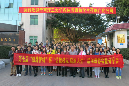 11月26日, 尽管气温骤降,但冬天的广州依然阳光灿烂,暖意融融。广州广化塑料管道有限公司迎来了一群朝气蓬勃的青年学生——他们是华南理工大学参与暑期访谈活动的学生志愿者。公司董事长林明松校友热情相迎,在公司产品展览厅亲自为学生讲解各种型号的产品特点并带领学生参观了生产车间。随后近70名学生记者来到番禺四海一家万隆厅举行“锋牌管材杯”第七届“访谈校友 启迪人生”大学生社会实践活动总结表彰会暨林明松校友创业分享会校友会秘书处秘书长陈艳、副秘书长周红玲、许中华、校友会秘书处顾问杨爱云和校团委陈强老师等参加了活动。