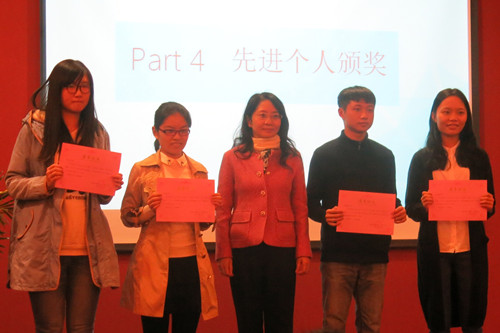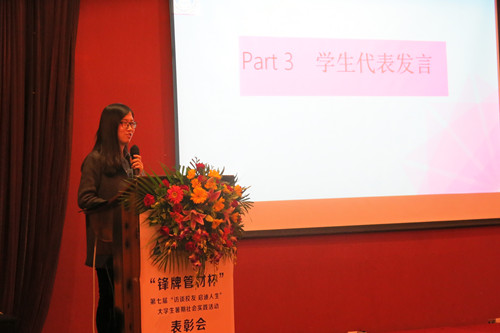 表彰分享会播放了访谈活动回顾视频,青岛队、湖南队、海南队和湖北队的学生记者代表与大家分享了参加暑期访谈活动的收获和感悟,青岛队彭睿同学说“我们在校友身上感受到最深的一点就是匠人精神,拥有对工作饱满的热情和追求突破自我的执着。”湖南队队长杨韵逸同学用朴实的语言讲述了她在报名参加校友会志愿者招募时从担心、紧张、压力山大到获得通过的惊喜过程。同学们纷纷表示“访谈校友 启迪人生”可以学到很多东西是他们一生难忘的经历和回忆。其中17位学生记者还获得了学校颁发的“2015年暑期社会实践先进个人”荣誉奖。