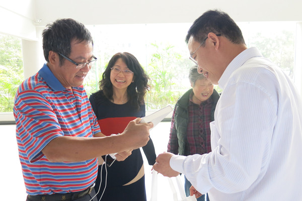 陈荣校友(左一)翻看学校书籍