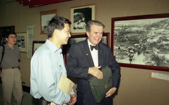 1998年10月,殷晓俊在国博展览上向时任法国驻华大使毛磊先生做介绍