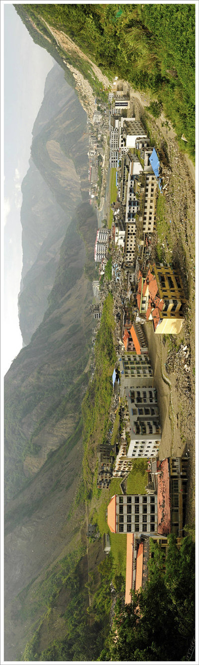 2008年殷晓俊拍摄的北川震后现场全景图,原图在图形工作站上打开,可以清楚看到建筑物窗内的家具。