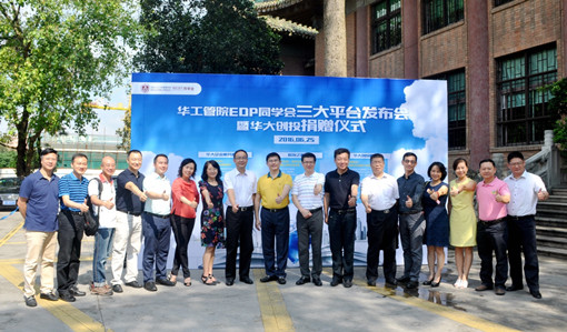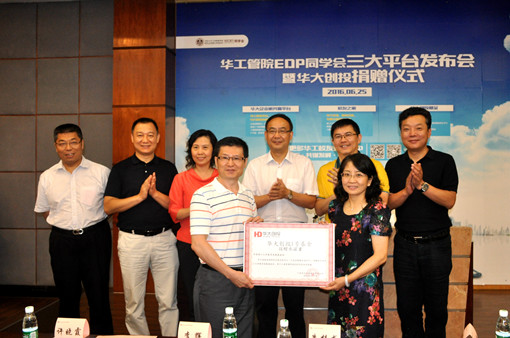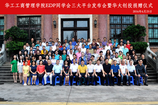 2016年6月25日,我校工商管理学院EDP同学会三大平台——信息化共赢平台、校友之家共生平台、华大创投共享平台启动发布会暨华大创投捐赠仪式在12号楼隆重举行。学校校友会秘书长陈艳、副秘书长麦冬宁,工商管理学院院长朱桂龙、EDP中心主任许晓霞,工商管理学院EDP同学会创会会长李辉、五十多名理事会成员以及一百多名校友共同到场,共贺平台创立。