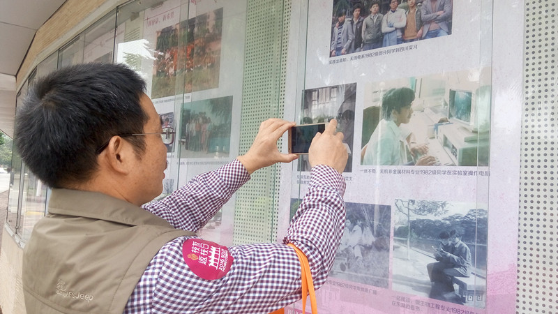 “看,这就是我!”1976级水泥专业的黄校友惊喜地在西湖长廊“臻爱·华园情”纪念图片展的老照片中发现了当年的自己,并迫不及待地拿出手机拍照留念。另一位校友指着一张合影说,他有一张一模一样的照片珍藏在家里,没想到学校把它给贴出来了。