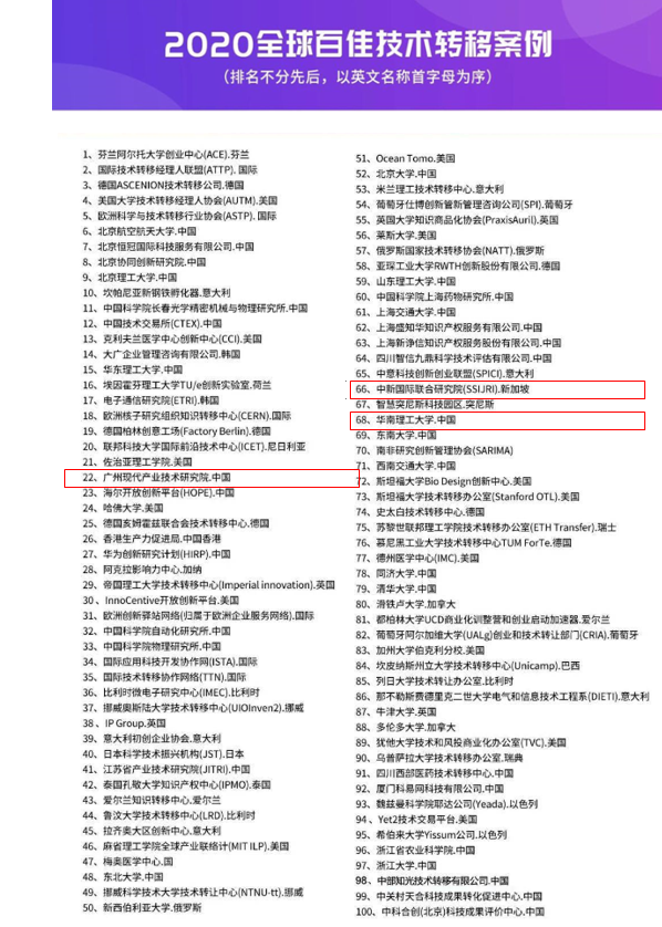 在9月8日举行的2020中国国际服务贸易交易会中国国际技术贸易论坛上,中国国际科技交流中心联合中国科技评估与成果管理研究会、国际技术转移协作网络(ITTN)、国际应用科技开发协作网(ISTA)、中国技术交易所等多家具有国际影响力机构,共同在论坛现场重磅发布“2020全球百佳技术转移案例”,华南理工大学、广州现代产业技术研究院和中新国际联合研究院成功入选。