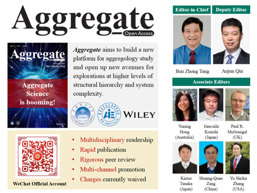Aggregate(《聚集体》)由华南理工大学、AIE高等研究院、Wiley出版集团三方合作创办,旨在成为报道聚集体科学基础和应用基础研究前沿科技成果的跨学科国际学术期刊。该期刊出版文章类型包括研究论文、综述论文、社论、重要研究亮点评述、人物介绍、一般研究评论、论说文。读者受众主要包括来自学术界和工业界的化学家、物理学家、材料学家、纳米技术学家、工程学家、生物学家&医学工作者、光电子学家、生态环境学家、分析科学家以及政策制定者。