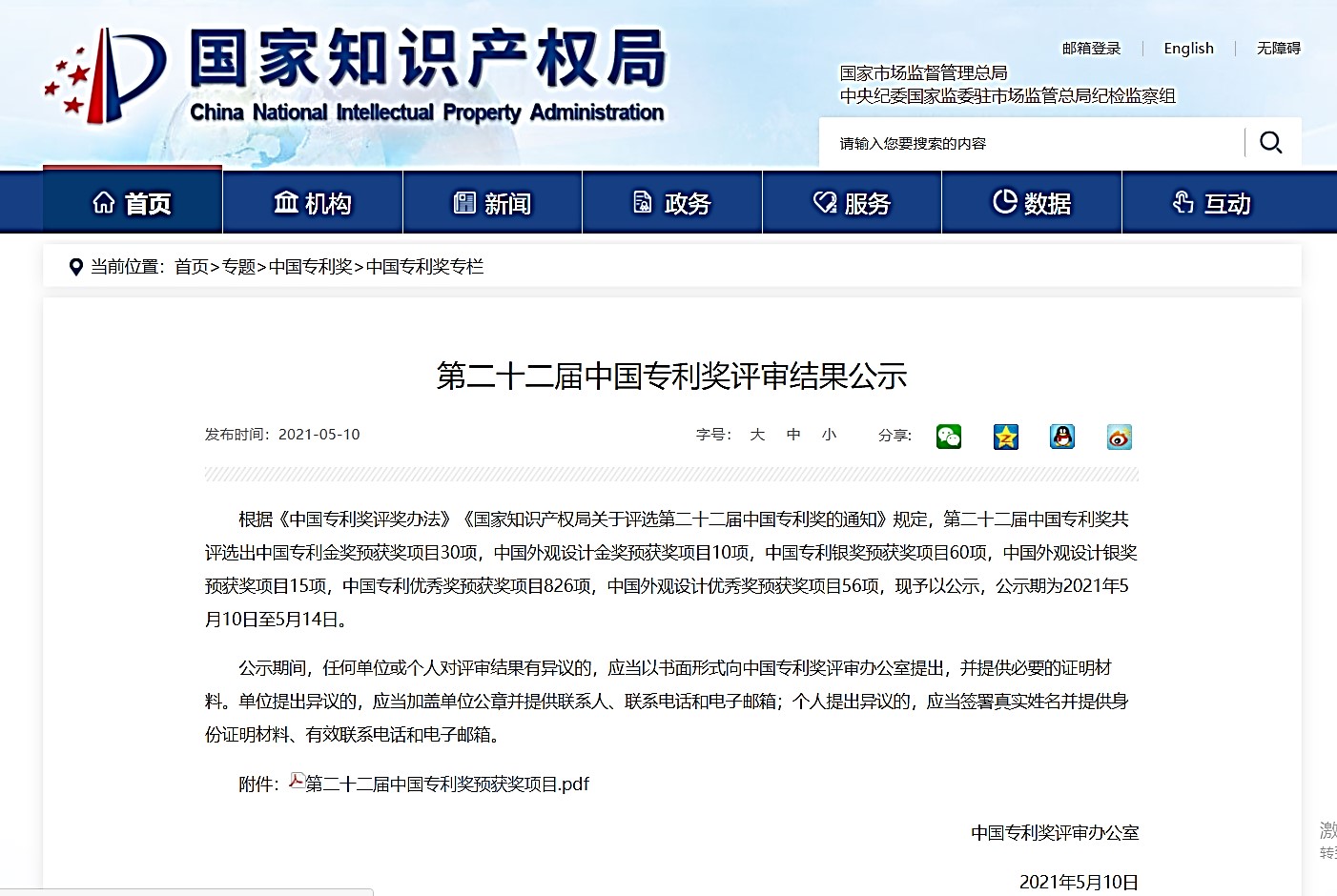 据悉,中国专利奖作为知识产权最高奖项,既是对科技创新能力的认可,也是对知识产权实力的肯定。本届中国专利奖共评选出预获奖项目中国专利金奖30项,银奖60项,优秀奖826项;外观设计专利预获奖项目金奖10项,银奖15项,优秀奖56项。