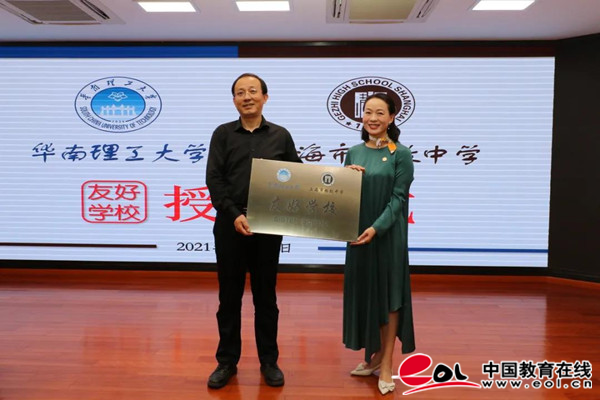 为推进优质资源共建共享和创新人才一体化培养,探索高中高校协同育人新模式,华南理工大学与上海市格致中学结为友好学校。5月10日下午,两校友好合作授牌仪式举行。华南理工大学党委副书记陶韶菁、上海市格致中学校长吴照、副校长钱勇伟及200余名师生出席仪式。