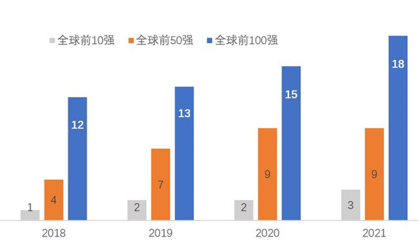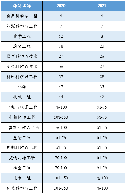华南理工大学在“软科世界一流学科排名”中的表现稳步提升。与2020年相比,学校排名全球前10的学科增加1个,为化学工程(第8名);排名前100的学科增加3个,分别为生物医学工程(51-75名)、土木工程(76-100名)、环境科学与工程(76-100名);上榜学科总数增加2个,分别是药学(401-500名)、地球科学(401-500名)。数学、管理学、生物医学工程等17个学科进步明显。