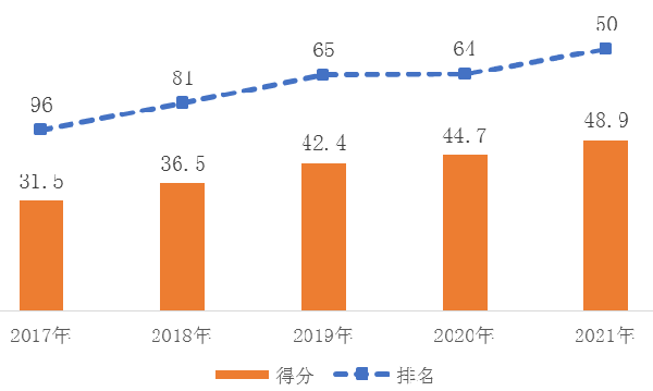 近年来,随着“双一流”建设和广州国际校区建设加快推进,学校办学实力和国际影响力的不断增强,在泰晤士高等教育亚洲大学排名上的表现稳步提升,综合得分由2017年31.5分提升至2021年48.9分、排名由96名提升至50名。学校各项指标表现不断攀升,2021年在 “产业收入”“引用”等单项指标上表现卓越,获得87.8分和69分,分别位居亚洲第45位和第 57位。