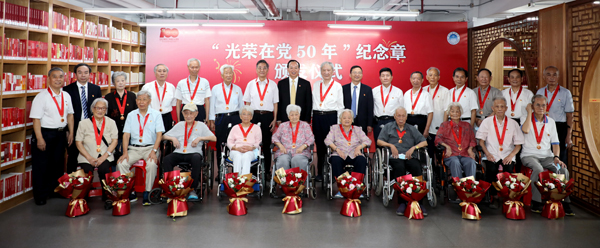 随后,章熙春、高松为老党员代表逐一颁发并佩戴“光荣在党50年”纪念章。