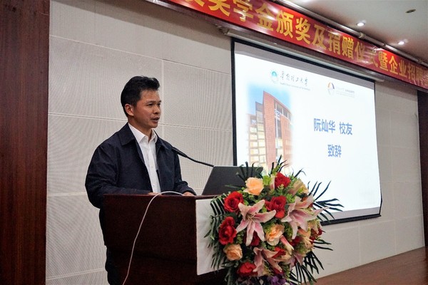 捐赠仪式上,学校党委常委代表学校接过阮灿华校友捐赠的150万元支票,并向其颁发捐赠证书和纪念牌。他对阮灿华校友多年来对学校的大力支持表示感谢。他表示,阮灿华校友在事业有成的同时,不忘母校,以深厚的爱国爱校情怀支持母校的建设与发展,学校也将用好捐赠资金,助力学生成长、成才,不辜负广大校友和社会各界对学校的殷切期望。