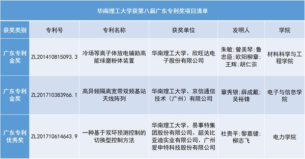 11月29日,广东省人民政府发布表彰通报,华南理工大学第二十二届中国专利奖6项获奖专利及第八届广东专利奖3项获奖专利获表彰。