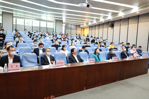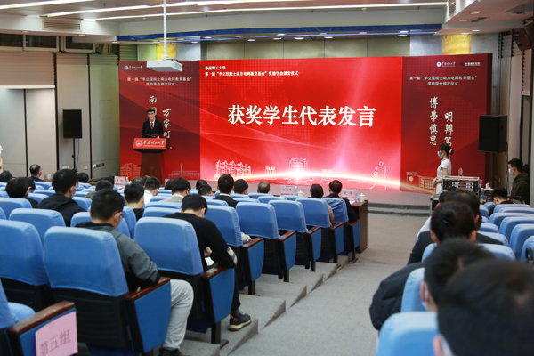 来自电力学院的硕士研究生岑伯维作为学生发言。他表示,基金的设立和李院士的捐赠不仅为同学们提供了物质上的扶持,更为同学们树立了精神上的标杆,鼓舞着华园青年创优争先、成长成才,成为推动我国行业未来发展和堪当民族复兴重任的时代新人。
