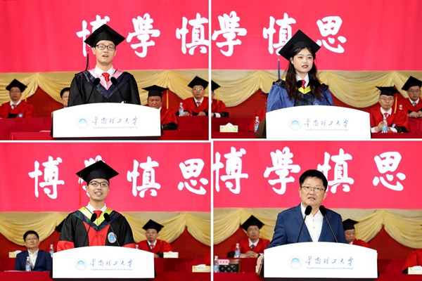 本科生代表、经济与金融学院2018级经济学创新班冼家进,硕士生代表、前沿软物质学院2019级材料科学与工程专业何淑倩,博士生代表、材料科学与工程学院2018级材料科学与工程专业郑昱林代表全体毕业生发言,汇报华园求学成果,被网友们称赞为“这都够我毕业好几回了”。他们向母校、师长、父母以及好友表达感谢,呼吁全体毕业生做奋发向上、薪火相传的华工人,坚守初心,拥抱更美好的未来。