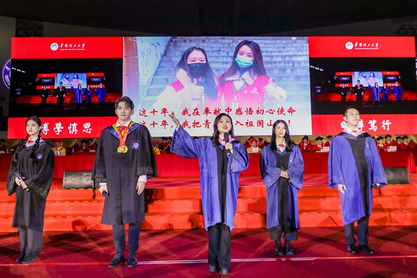 党的十八大以来的十年里,华工青年积极响应时代的召唤,赓续红色血脉,担当时代使命,奉献扎根基层,求索科学前沿,拼搏超越自我,以实际行动迎接新时代的挑战,交出了华工学子的青春答卷。毕业典礼现场,音诗画朗诵“这十年·青年讲”和歌舞演绎“一起向未来”以青春告白母校和祖国,将现场气氛推向高潮。