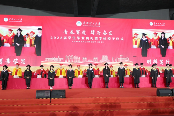 朱敏现场宣读了《关于公布华南理工大学2022年授予学士、硕士、博士学位人员名单的通知》。各位领导和嘉宾为2022届毕业生代表颁授学位,各学院院长为本学院毕业生代表授予学位。