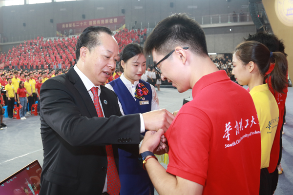 开学典礼现场举行了校徽佩戴仪式。章熙春、徐向民、晋刚分别在广州国际校区、五山校区、大学城校区主会场为新生代表佩戴校徽,同时将《习近平与大学生朋友们》《广东工业专科学校校史考(1910-1952)》两本书作为入学礼赠送给新生,希望“新华工人”能够在喜迎二十大和学校组建70周年暨建校105年的历史交汇点,谨记习近平总书记对青年人的关心、关注和关爱,传承好华工百年来的红色血脉,青春向党,矢志奋斗,努力成为堪当民族复兴大任的新华工人。