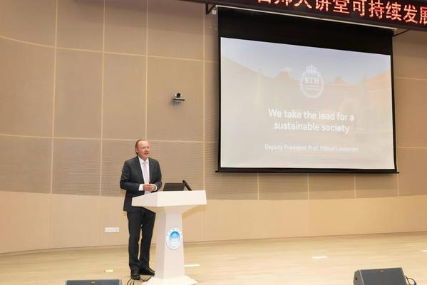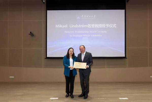 随后的讲座上,Mikael Lindström受聘为华南理工大学名誉教授,李卫青为其颁发聘书。他详细介绍了KTH在可持续发展和创新方面的卓越成就,以及在支持创新和推动全球可持续发展目标方面的举措。